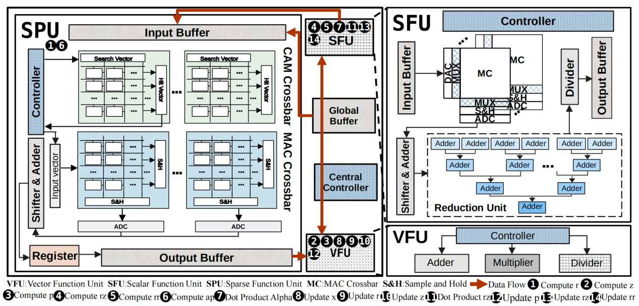 整个CG算法是相当复杂的,涉及由标量、向量、矩阵和稀疏类型等多种算子组成的各种操作,总共超过10种(如Algorithm 1所示)。在基于ReRAM的硬件上直接实现CG需要实现所有操作。然而,这种方法需要构建10多个不同的硬件模块,并在每个模块内为不同类型的算子设计单独的组件。对于矩阵规模稍大的问题,这种架构会变得复杂且庞大,导致巨大的硬件成本。