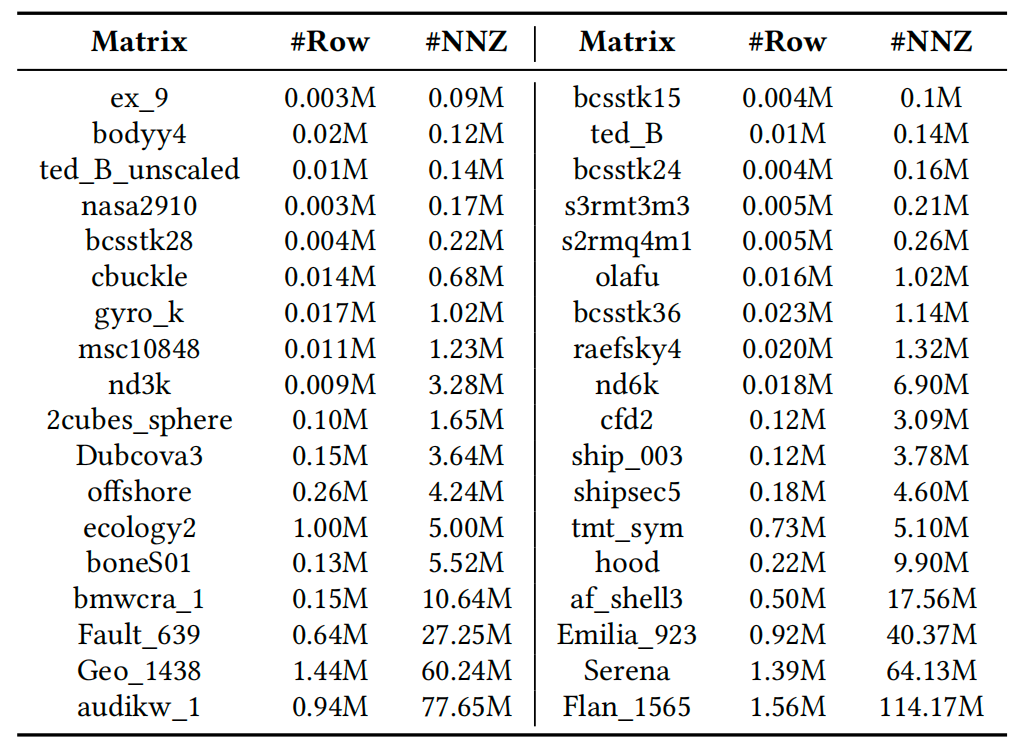 本工作评估了来自SuiteSparse Matrix Collection的36个稀疏矩阵,它们来自计算流体力学问题、电力网络问题、结构问题等不同领域,表1提供了每个矩阵的信息。我们使用NeuroSim和NVSim对ReCG的性能和能耗进行仿真,并与CPU和GPU上的PETSc以及FPGA上的CALLIPEPLA进行性能和能耗比较。