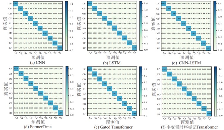 不同算法在四种不同评价指标上的对比结果呈现在表1中。从表1中可以看出 CNN和LSTM 的表现略差于 CNN-LSTM 的综合表现,这表明在 CNN 特征提取的基础上融合LSTM 时序依赖特征提取的效果更好。此外,两种用于处理多变量时间序列分类的 Transformer 变体方法 FormerTime 和Gated-Transformer 均呈现出优于上述三种方法的表现,表明 Transformer 相比传统深度学习方法(CNN和 LSTM 等)在长时依赖特征提取方面更具优势。更重要的观察是,所提方法的综合表现优于所有对比方法,表明所提方法中设计的多变量时序标记策略更适于处理在电潜泵故障诊断任务。
