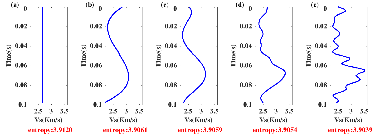 为了对于熵有一个更为直观的理解,下图展示了5种不同模型对应的幅度熵。其中,第一幅子图中幅度为常数,我们难以从其中获得有关于地质结构的任何信息,因此不确定性较大,熵值较大;反观最后一幅子图,其变化较为剧烈,我们可以获得更多的地质信息,因此其熵值最小,不确定度最低。因此,采用振幅熵实现正则化可以降低反演的不确定性,提升反演稳定性和分辨率。