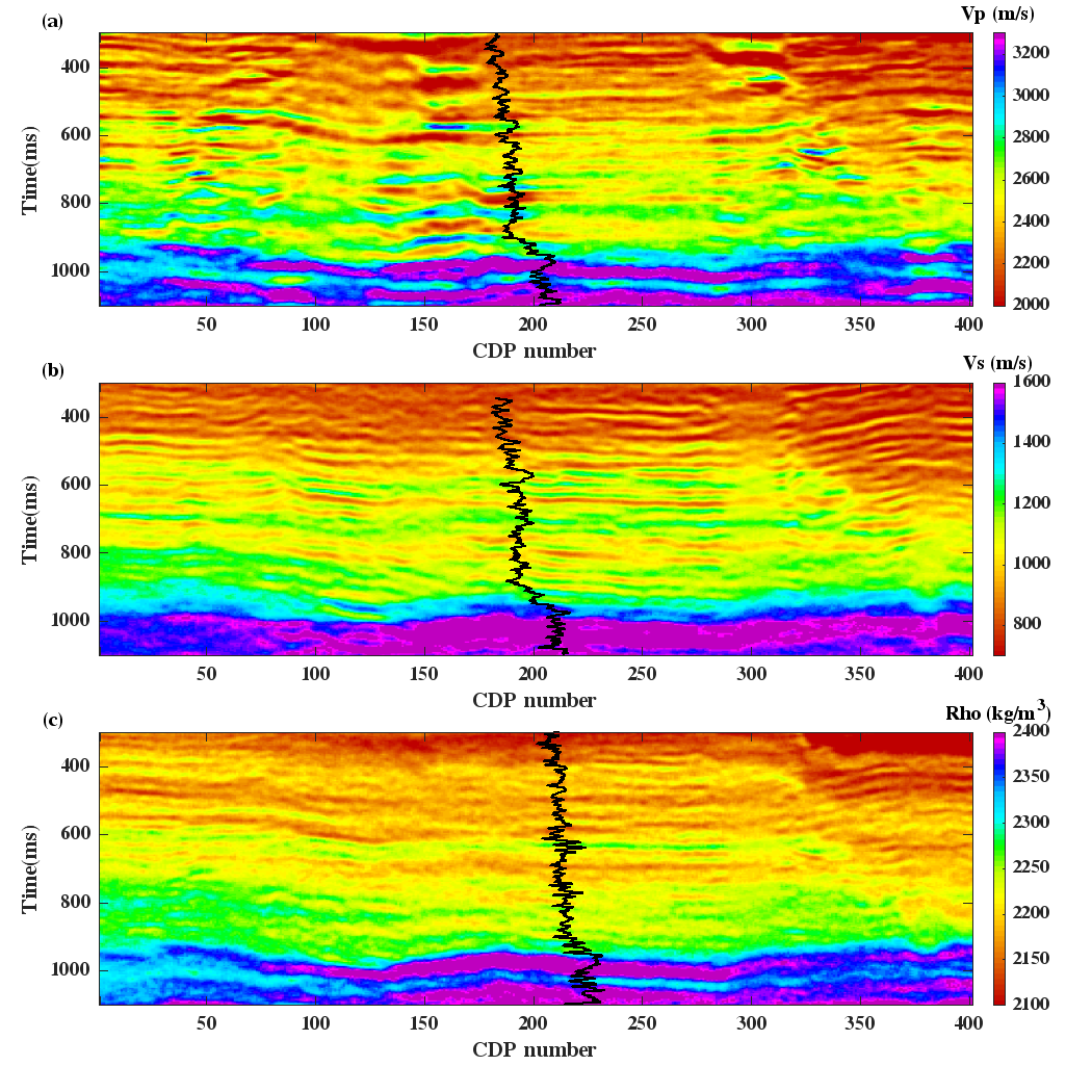 图2-图4所示为对来自中国东部某实际油田资料处理结果。分别对应基于L2范数正则化、L1范数正则化、振幅熵正则化的反演结果。每幅图从上至下依次为纵波速度、横波速度、密度反演结果;图中黑线为对应第203道的测井曲线。从反演结果不难看出,基于L2范数正则化的反演结果分辨率较低,反演剖面较为模糊。基于L1范数正则化的反演结果分辨率有所提升,但仍不及基于熵正则化的反演结果,与前两种正则化反演结果相比,基于熵正则化的反演结果分辨率较高,连续性较好,与测井曲线的变化趋势也较为吻合,证明了本文提出算法的有效性和实用性。