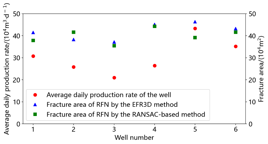 此外,现场案例分析发现重构缝网与微地震事件贴合紧密,且重构裂缝面积与产量分布较为一致,证明了本文方法的实用性。