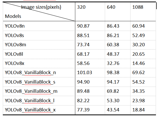 表3 YOLOv8_VanillaBlock与YOLOv8在不同尺寸的输入图片下的FPS