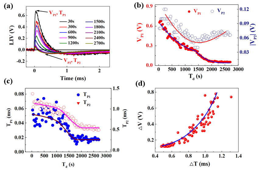 图2(a)选定时间的油页岩的LIV响应;(b)VP1和|VP2|随时间Td的变化;(c)TP1和 TP2随时间Td的变化;(d)电压的变化量ΔV(ΔV= VP1 - VP2)和时间ΔT(ΔT= TP2 - TP1)的关系。