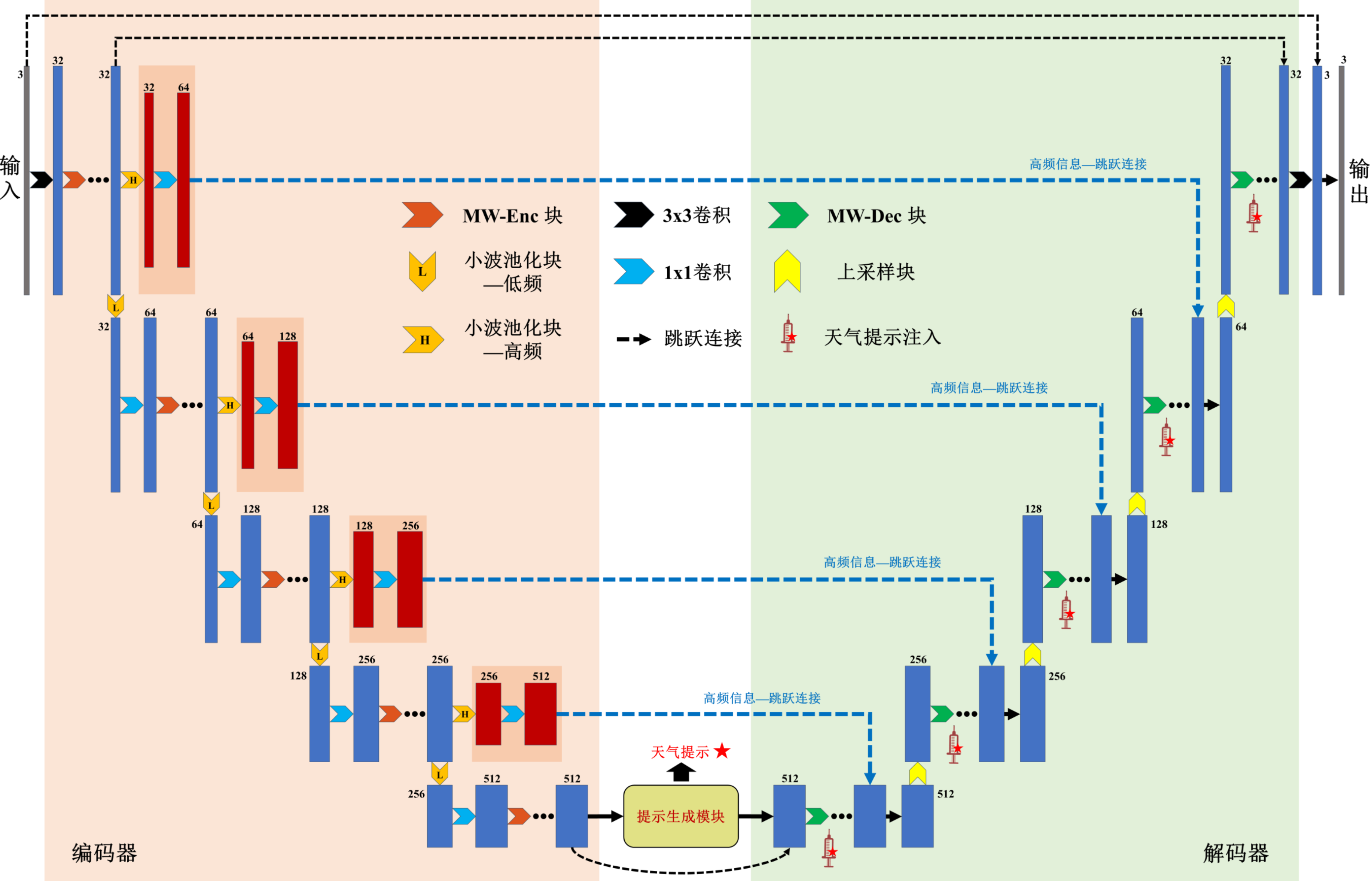 为了满足实时性要求并设计一种简单高效的多降质恢复算法,本文提出一种完全基于简单卷积的多降质恢复网络MW-ConvNet。该网络旨在解决多种降质因素导致的图像退化问题,其整体架构如下图所示。MW-ConvNet采用含有跳跃连接的经典U形网络U-Net的结构。其整体架构可以划分为五个连续阶段,依次为浅层特征提取阶段、编码器阶段、提示生成模块、解码器阶段和图像重建阶段。