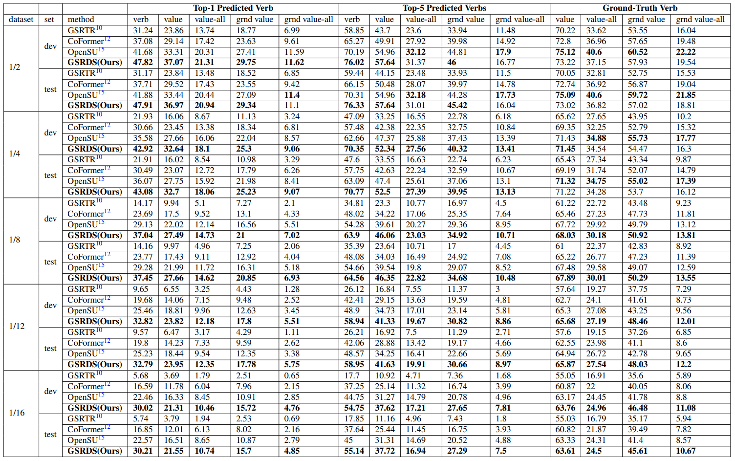 在本文中,我们针对数据稀缺场景下的GSR任务进行研究,设计了GSRDS模型。具体来说,我们利用EfficientNetV2-M来替代ResNet50提取图像特征,并设计TCCV模块,结合CLIP图像编码器提取的特征,得到了更准确的动词分类结果。同时,我们设计了Multi-VR Queries和DPD模块来共同改进边界框检测精度。我们分别在五种数据量设置的条件下进行了对比实验和消融实验,验证了我们模型在数据量较小的场景下,可以取得较为优异的表现性能。
