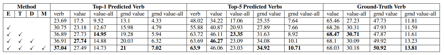 表1的结果展示了在五种不同规模数据量的设置下,GSRDS与其他三个模型在14个指标上的对比结果。我们针对其中5个关键性指标绘制了折线图如图2所示,(a),(b)和(c)图分别代表在Top-1 Predicted Verb设置下verb , value 和grnd value 指标在五种数据量级上的实验结果;(d)和(e)图代表在Ground-Truth Verb设置下value 和 grnd value指标在五种数据量级上的实验结果。可以看出,随着数据量的量级减小,GSRDS模型的优势愈发明显。表2展示了消融实验结果。