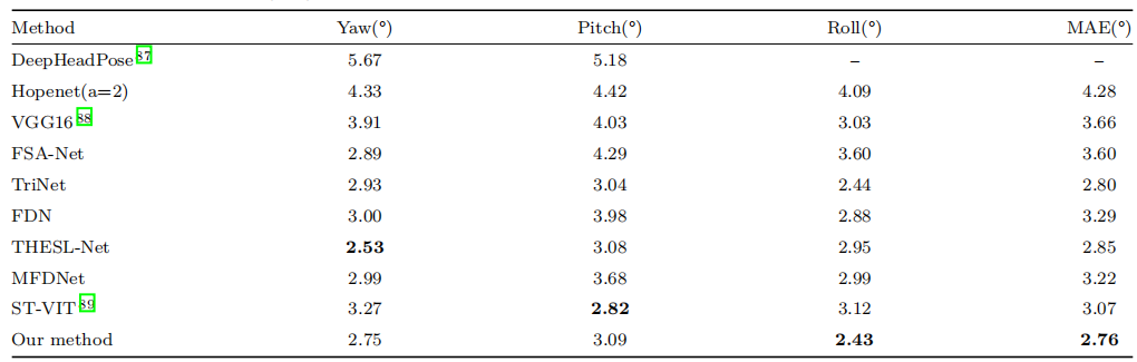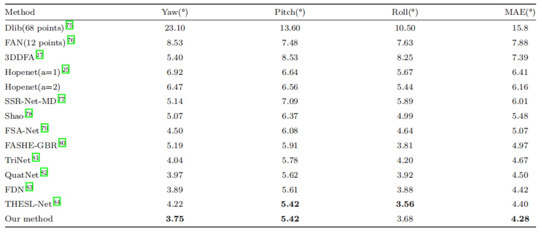 为了定量地评估我们的方法的准确性,表1和表2显示了最先进的方法和我们的方法与AFLW2000和BIWI数据集的MAE。粗体表示每一列中的最小值。结果表明,我们建立的关键点和头部姿态之间的非线性关系更稳健。在BIWI-train数据集上重新训练该模型,并在BIWI-test数据集上进行测试。实验结果见表3,表明所提模型的性能最优。可以看到,本文模型在所有数据集上都达到了最低的总体MAE,并且在单个数据集上也表现良好。
