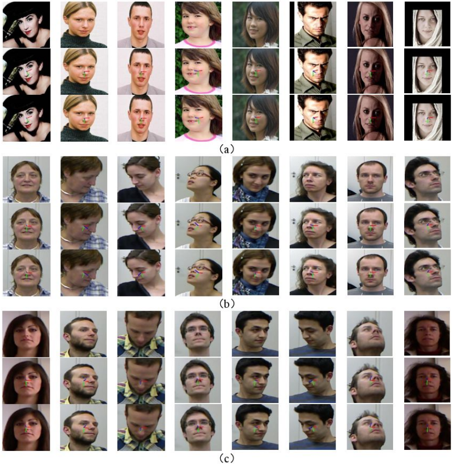 图5显示了不同方法在AFLW20002000、BIWI和BIWI-test数据集上的结果。可以看出,本文模型能够合理地估计各种头部姿态。