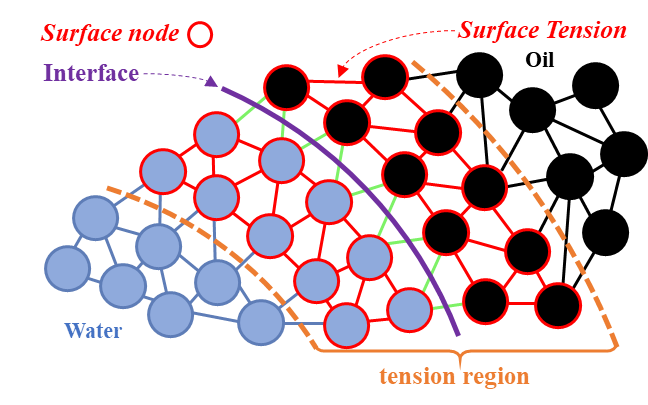 其中,ρo−w和po−w分别为油水混合物的压力和密度,To和Tw分别为油和水黏性力张量,uo−w是混合物的速度,udo和udw分别为水相和油相的漂移速度。表面张力中粒子间的相互作用力方程为:
