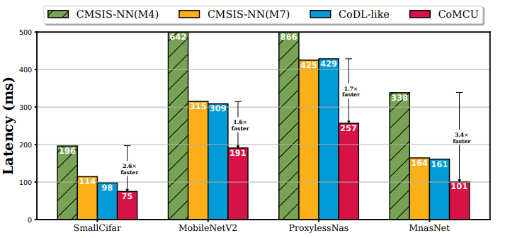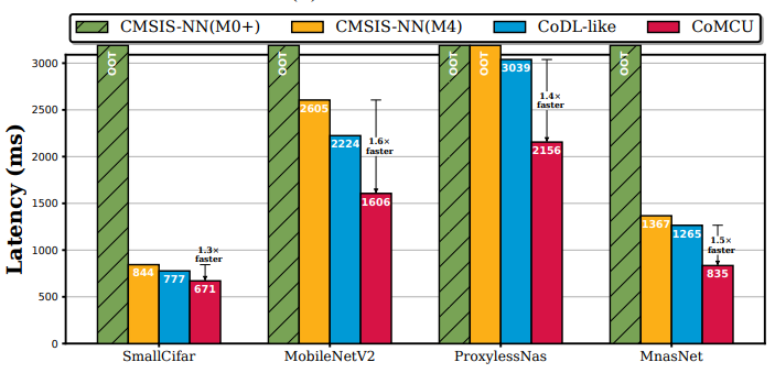 我们首先在同构双核微控制器STM32H745上评估CoMCU的性能,如图2所示。从图中可以看出,相较于利用单核MCU进行模型推理的CMSIS-NN,CoMCU可以实现1.6倍的推理加速。此外,相较于现有的IOP系统,CoMCU也能够实现1.7倍左右推理加速。