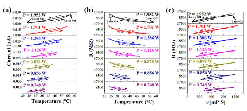 图3(a)在不同激光功率下, 电流与温度之间的关系;(b)在不同激光功率下,原油的电阻R随着温度的变化;(c)在不同激光功率下,原油的电阻R随原油粘度v的变化。