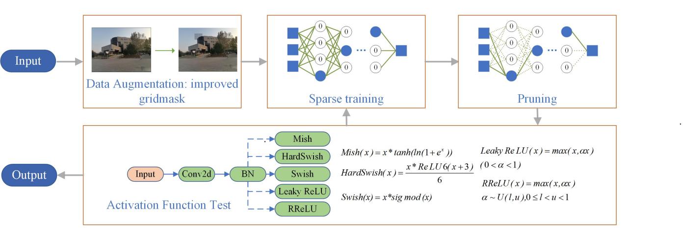 建筑物检测方法的总体过程如图1所示,包括以下步骤:(1)对数据集进行数据增强,并使用改进的GridMask方法引入随机噪声来模拟实际遮挡情况。(2) 对改进后的模型进行稀疏训练,使BN层的参数接近0。(3) 我们根据剪枝率来裁剪BN层参数。(4) 我们用Mish代替激活函数,并比较其与不同激活函数的有效性。