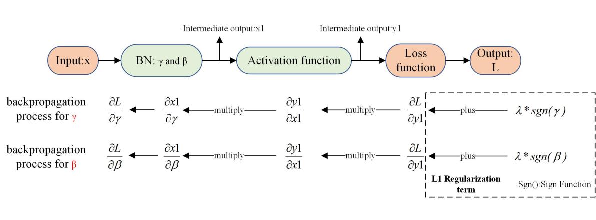 不同激活函数对模型性能的影响可归因于梯度反向传播和稀疏训练的机制。对于Conv模块,反向传播的梯度将从激活函数梯度传输到BN层,用于更新BN层参数。整个过程如图7所示。损耗函数相对于BN层参数的梯度由四个部分组成:BN层输出相对于BN层的梯度γ和β,激活函数的梯度,损耗函数相对于激活函数输出的梯度,以及L1正则化带来的梯度变化。BN层输出相对于BN层参数的梯度和损失函数相对于激活函数输出的梯度取决于网络的输入和输出。此外,L1正则化产生的梯度变化是恒定的。因此,对于不同的激活函数,损失函数相对于BN层参数的梯度可能不同,并且不同的激活功能可能影响L1正则化对梯度更新的影响,从而影响稀疏训练的效果。