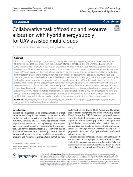 近日,学院计算机科学与技术专业2019级本科生周宇以第一作者撰写的学术论文“Collaborative Task Offloading and Resource Allocation with Hybrid Energy Supply for UAV-Assisted Multi-Clouds”在云计算知名期刊《Journal of Cloud Computing-Advances,Systems and Applications》公开发表,指导教师为黄霁崴教授,论文作者还包括2019级硕士研究生葛慧、2021级硕士研究生马博闻和2021级本科生张书航。