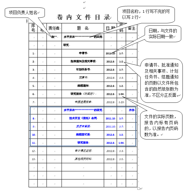 基金项目卷内目录示例: