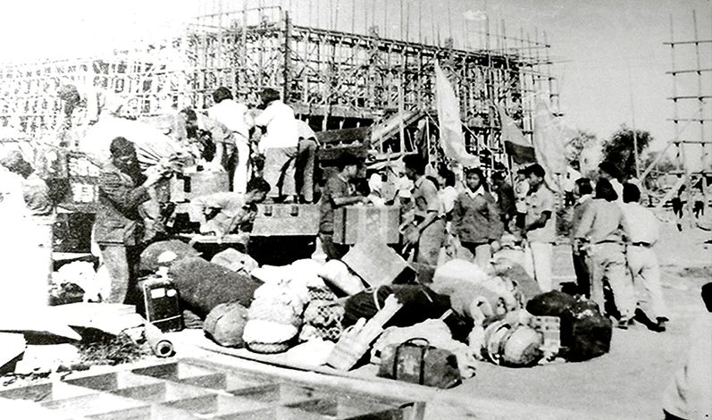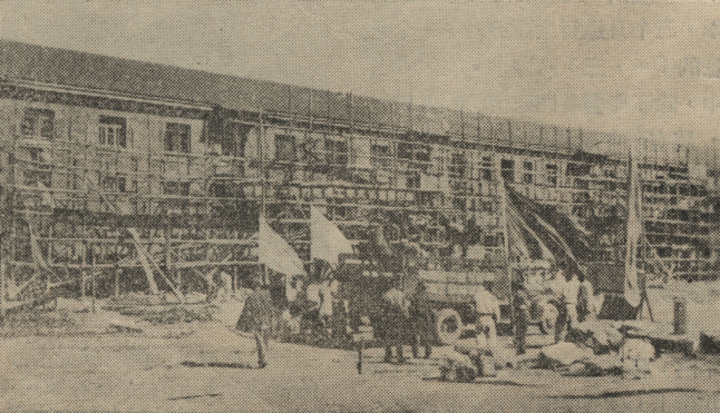 “筹备处副主任贾皞分工负责基建工作,任务十分艰巨。1953年4月,石油工程系教职工到建校的九间房村校址参观时,还只是看到几排施工工人住的工棚,学校的建筑物一点儿也看不见,正在打地基。距当年开学只有五个多月的时间,怎么来克服困难?筹备处在贾皞同志领导下,采取了多项正确的应急措施。集中人力、物力、财力,保障一栋学生宿舍楼(定名为工字楼)尽快先建成,用作师生员工居住,行政教学办公以及图书阅览和医疗。总之,就以这样一些简易快速有效的措施,保障了开学时教学、生活的基本需要。”(方华灿)