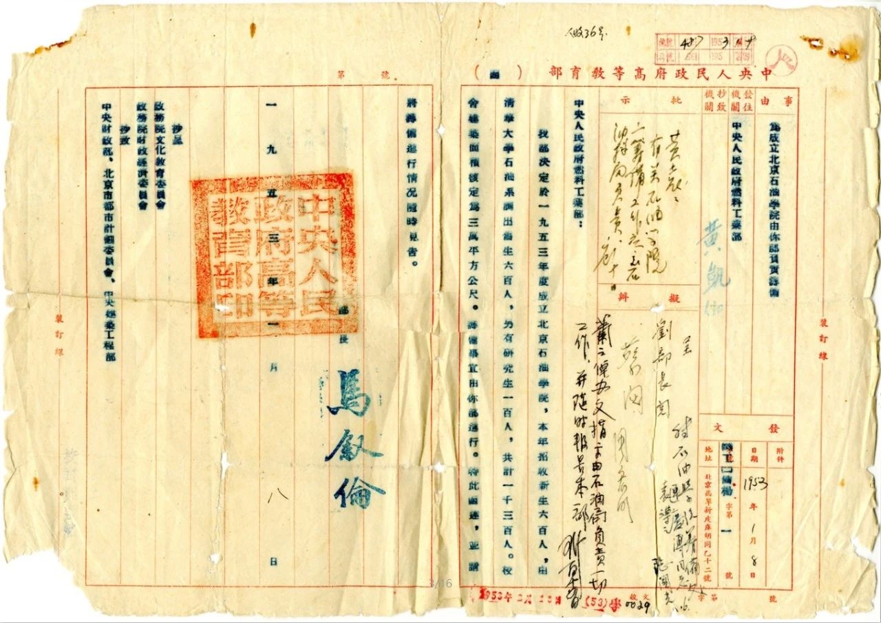 1953年1月15日,燃料工业部和教育部联合发文,成立北京石油学院筹备委员会。
