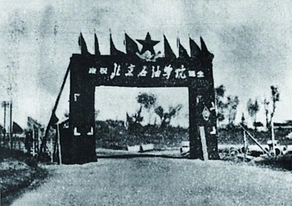 北京石油学院建校初期的简易大门。
