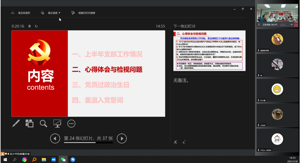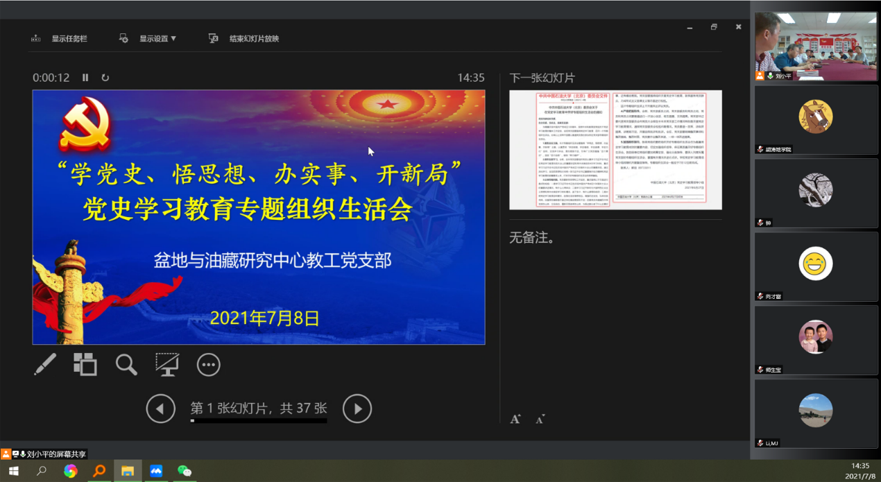 2021年7月8日下午,地球科学学院盆地与油藏研究中心教工党支部召开“学党史、悟思想、办实事、开新局”党史学习教育专题组织生活会,会议通过线下(在地质楼721党员活动室)和线上(腾讯会议)两种形式展开,支部共有26名党员参加了,其中3名正在辽宁兴城带本科生野外综合地质实习的教工党员线上参加。