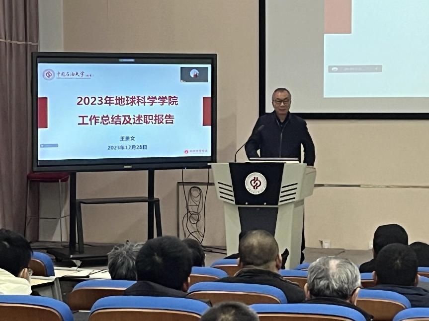 凝心聚力担使命,奋楫扬帆新征程。2023年12月28日下午,地球科学学院以线上线下相结合的方式,举行2023年学院领导述职暨教职工年终总结表彰大会。学院党委书记姜福杰、院长王贵文、党委副书记王茹、副院长牛花朋、刘钰铭以及全院教职工参加会议。大会由学院党委书记姜福杰主持。