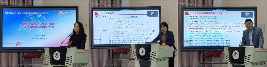 接下来党委副书记王茹、副院长牛花朋、刘钰铭,分别就自己分管的工作作学生工作、研究生教育教学工作、本科生教育教学工作向全院教职工进行了汇报。