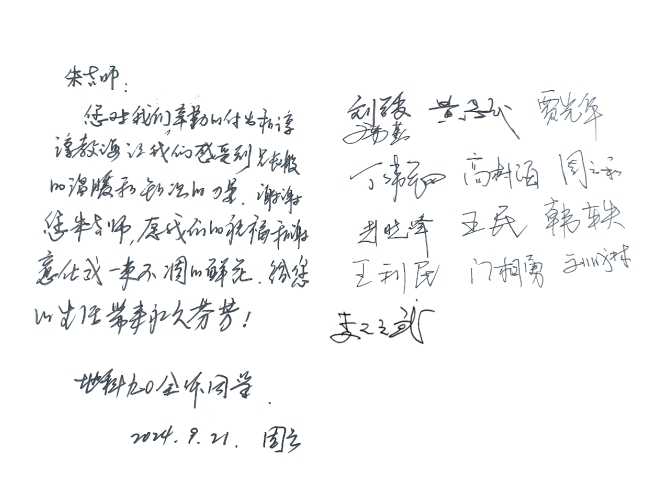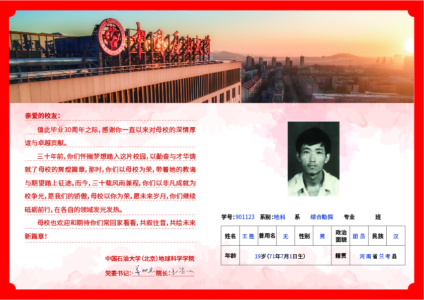 班主任费安玮老师发来祝福:“因有事脱不开身,明天下午的聚会我就不参加了,谢谢你们!地90是p站中文网站(北京)的第一届本科生,你们已毕业工作30年了,又恰逢新中国成立75周年及p站中文网站71周年校庆之际,地90班在北京昌平校区的聚会就更有意义了。祝地90的同学们身体健康、事业有成、家庭幸福,为国家的石油事业、为祖国的繁荣昌盛再奋斗10年,母校p站中文网站(北京)为你们而自豪!祝大家聚会快乐!”