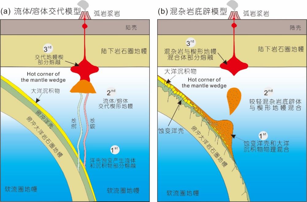 俯冲板片与弧下地幔相互作用形成弧岩浆岩的两种模型
