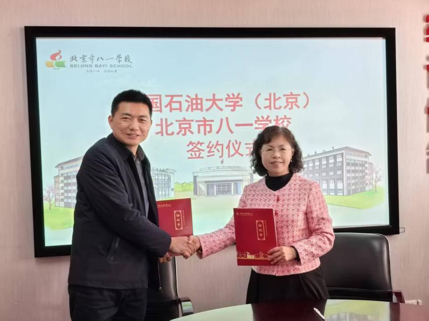 王华蓓校长和沈军书记对中石大一行的到来表示欢迎,并介绍了北京市八一学校的发展历史及办学特点等情况,表达了八一学校在地学科普、地球科学竞赛等课程建设方面的需求,双方就中学地学科普建设以及招生就业等问题进行探讨并达成共识。