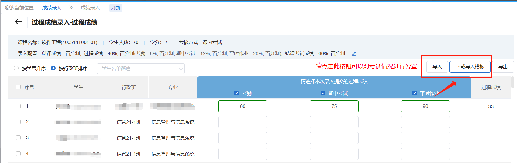 (2)模板导入:可以点击右上角的下载导入模板,成绩填入模板后,点击导入上传即可。