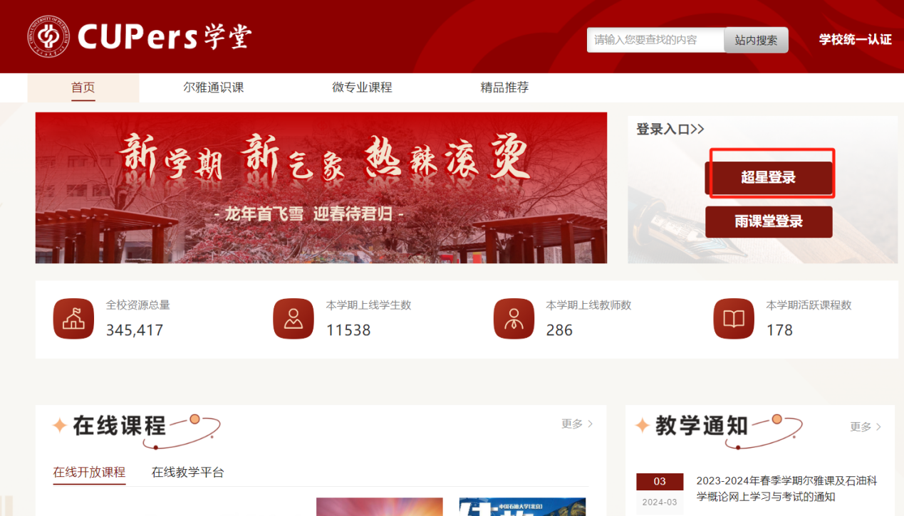 2.使用中国p站中文网站(北京)网络学习平台,进入CUPers学堂(http://cup.fy.chaoxing.com/),选择“超星登录”,点击“新用户注册”,输入手机号获取验证码,并设置登录密码,然后点击下一步进入完善信息界面,输入学号和真实姓名,点击下一步完成注册登录,然后进入个人空间。后续登录可以选择手机号+密码或者手机号+验证码的方式登录。