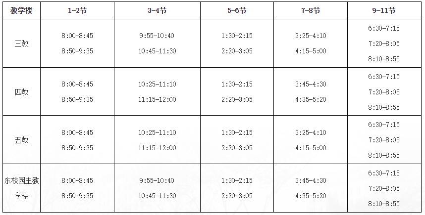 任课老师按照课表安排的节次和授课地点错时上课。三教、四教、五教、东校园主教学楼分为两个不同的时间段错时安排上课,每个时间段错开30分钟,每小节授课时长每