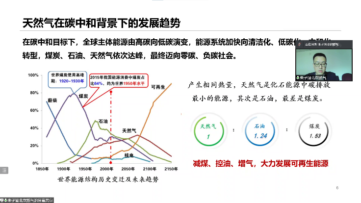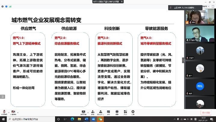 讲座中,朱子涵研究员主要讲解了在碳达峰及碳中和总体国家政策趋势下,传统城燃企业能源转型的思考,深入讲解了天然气在当前形势下发展的不确定性以及面临的机遇与挑战,并且从国际大环境下探讨了甲烷减排的重要性以及我国发展燃气能源转换的必要性。