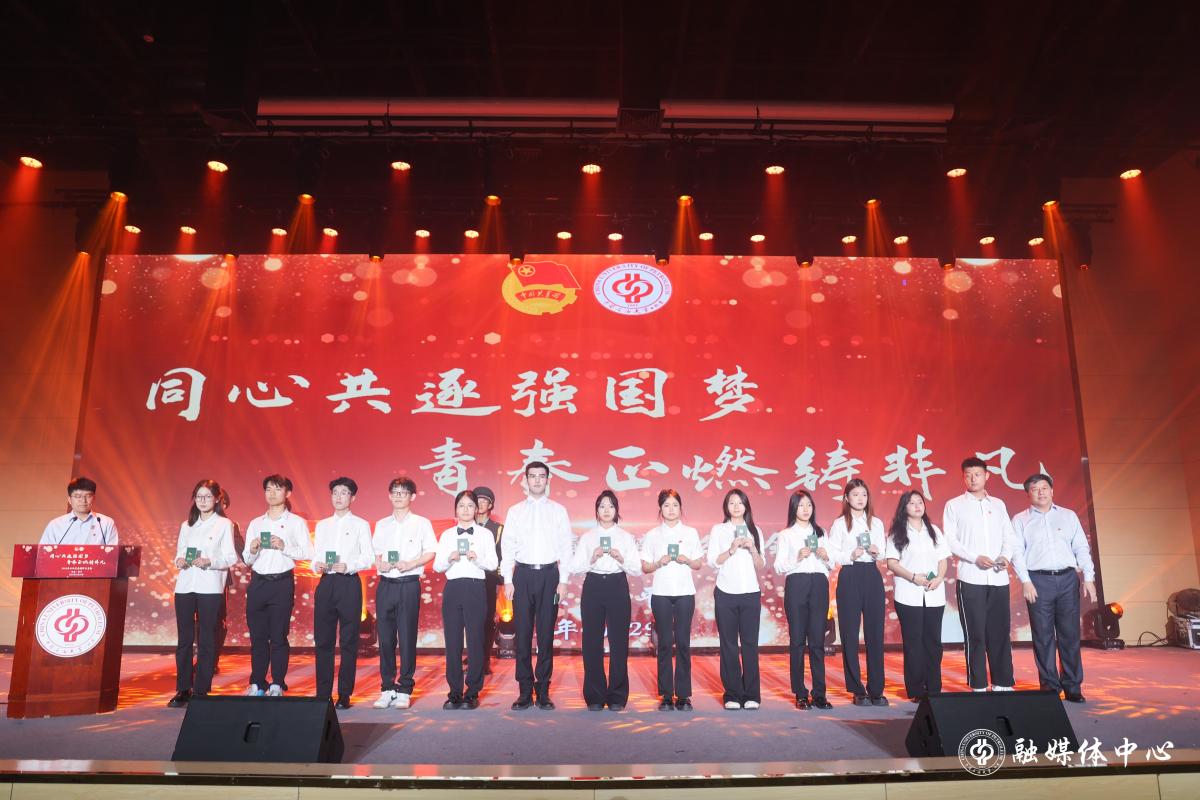 会前,学校党委副书记、纪委书记韩克飞为新发展团员代表佩戴团徽、颁发团员证,校团委书记周学智主持入团仪式,人工智能学院团委书记代莉莎带领新发展团员进行入团宣誓。