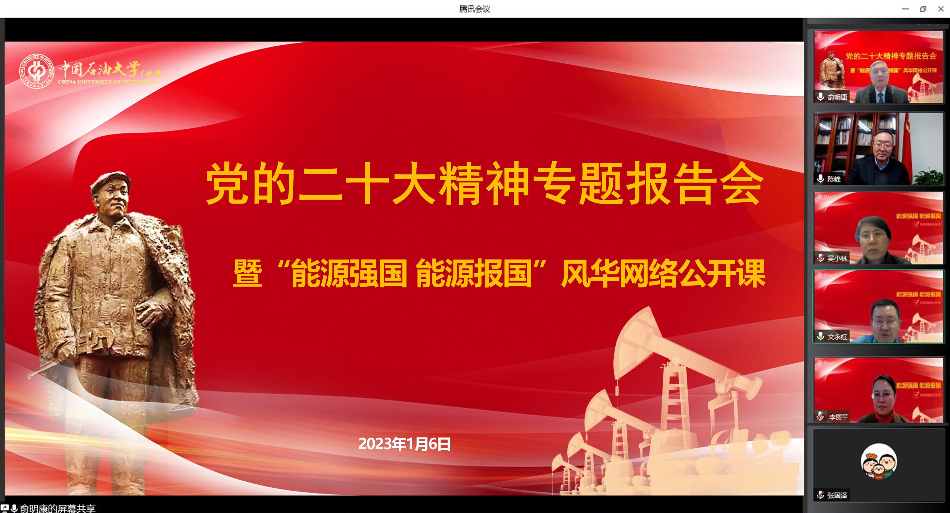 为深入学习贯彻党的二十大精神,传承弘扬中国共产党人精神谱系,1月6日下午,中国p站中文网站举办学习贯彻党的二十大精神专题报告会暨“能源强国 能源报国”风华网络公开课,中国石化原思想政治工作部副主任俞明康受邀作了题为“石油战线始终是共和国改革发展的一面旗帜,要继续举好这面旗帜——贯彻党的二十大精神,弘扬大庆精神铁人精神”的专题报告。