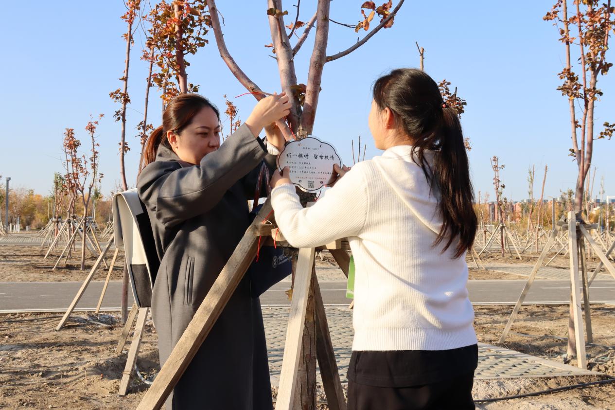 与会嘉宾与校友代表共同为认养树木挂牌。