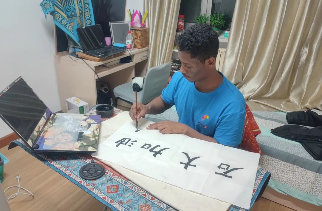 拿出我最喜欢的笔墨纸砚,静心、凝神,思考、沉淀,还有留学生们也用毛笔字为“中石大加油!”