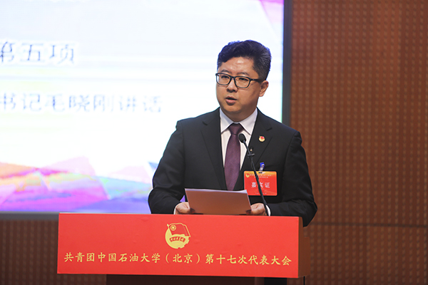 石大团委书记周玉成代表第十六届委员会向大会作了题为“不忘初心,紧跟党走,为建设石油石化学科领域世界一流研究型大学贡献青春力量”的工作报告。报告回顾了过去六年的团学工作,指出六年来学校共青团组织在思想引领、组织建设、创新实践、校园文化建设工作方面取得了瞩目的成果,围绕“凝聚青年、服务大局、当好桥梁、从严治团”四维工作格局,团结带领全校广大青年不忘初心、紧跟党走。报告对共青团今后五年的工作进行了部署和展望。报告指出,未来五年石大共青团工作将以《中共中国p站中文网站(北京)委员会关于进一步加强和改进共青团工作的若干意见》为统揽,围绕一个根本任务,聚焦两大阵地,完善三个平台,筑牢四大基石,团结带领全校广大青年不忘初心,牢记使命,向着把学校建设成为石油石化学科领域世界一流研究型大学的宏伟目标不懈奋进。