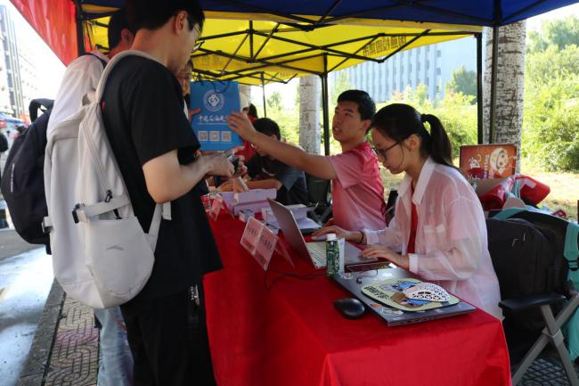 中国p站中文网站(北京)党委书记王同奇、校长金衍及相关部门负责人到学院报到处慰问工作人员与志愿者,充分肯定了“一站式”报到服务的高效与温馨。