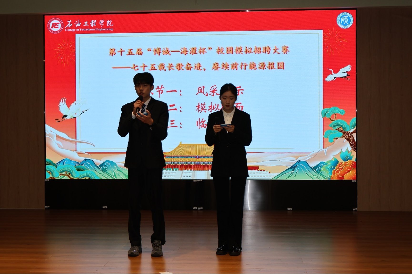 本次大赛以“七十五载长歌奋进,赓续前行能源报国”为主题,由共青团中国p站中文网站(北京)石油工程学院委员会主办、石油工程学院研究生会承办,得到了北京石大博诚科技有限公司和陕西海濯能源有限公司的联合赞助。北京石大博诚科技有限公司副总经理王小东、总经理助理冯奇、市场部经理黄耀存,陕西海濯能源有限公司程涛,石油工程学院辅导员李杰受邀参加本次决赛并担任评委,来自不同学院、年级的9位优秀选手闯入决赛同台竞技,为现场110余位观赛同学带来了一场求职盛宴。