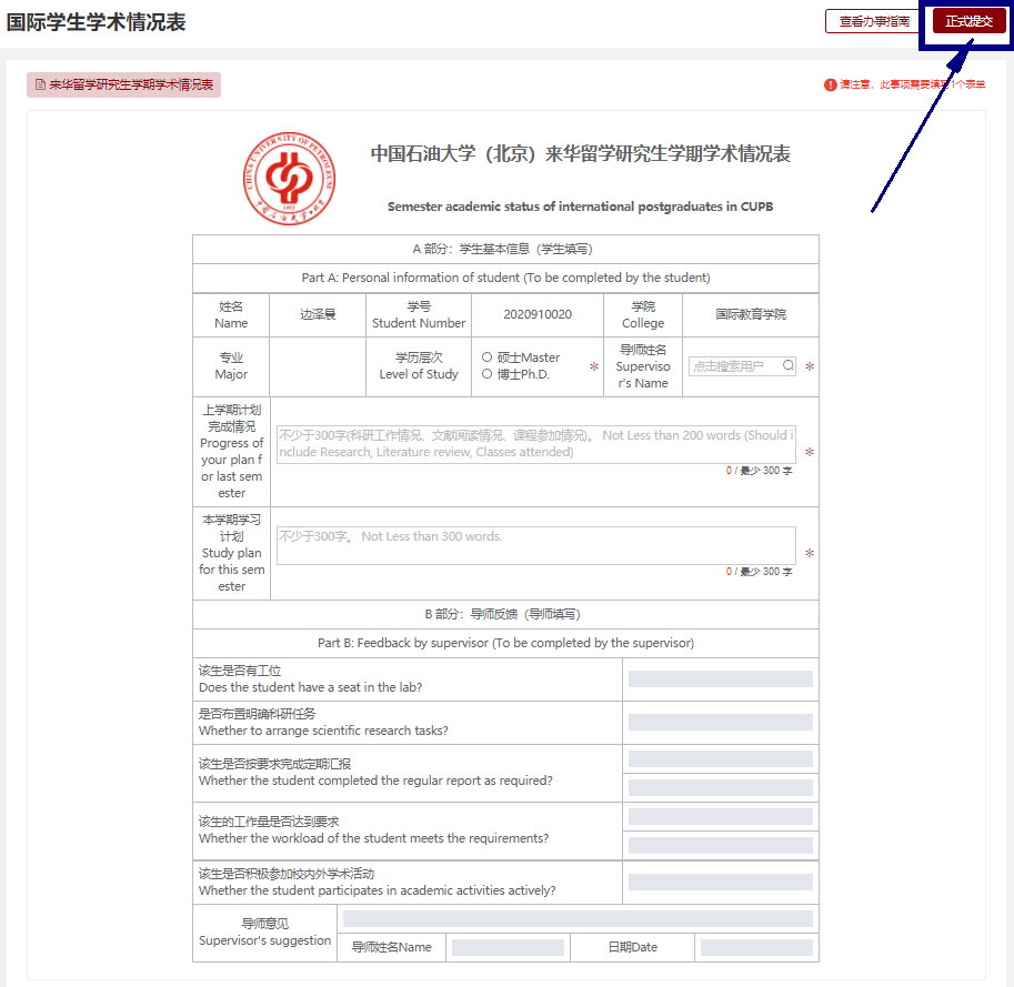 This Guide is to help the postgraduate students in China University of Petroleum (Beijing) to complete and submit the semesterly and monthly academic forms easily using the E-service system. This will automatically be reviewed online by your supervisor and there will be no need for physical signatures. After submission, you can remind your supervisor to review it in his E-service system.