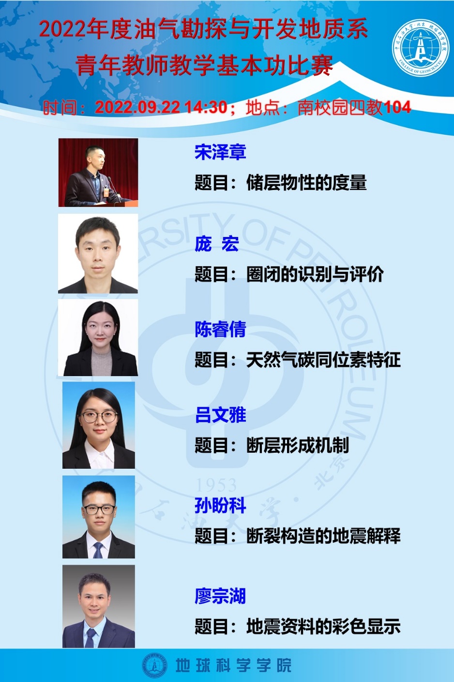 为了进一步提高青年教师业务水平,促进青年教师磨练教学内功,夯实教学基本功,提升教学质量,2022年9月22日下午,地球科学学院油气勘探与开发地质系举办青年教师教学基本功比赛。由我校“北京市教学名师”柳广弟教授、吴胜和教授、岳大力教授,“北京市青年教学名师”陈冬霞教授担任评委,我系6位青年教师参赛。