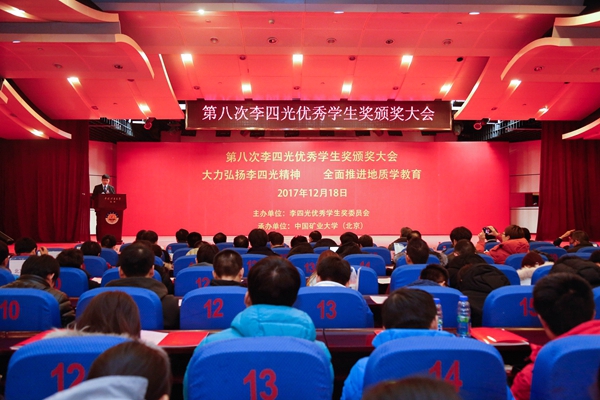 12月18日下午,第八次李四光优秀学生奖颁奖大会在中国矿业大学(北京)举行。出席颁奖大会的嘉宾有国务院参事、国土资源部原总工程师、李四光地质科学奖基金会理事长张洪涛、原国土资源部科技与国际合作司司长姜建军、原李四光地质科学奖委员会秘书长王泽九、教育部科学技术司司长雷朝滋、中国地质调查局原党组成员、中国地质科学院原党委书记、副院长、李四光地质科学奖委员会秘书长王小烈、中国工程院能源与矿业学部主任彭苏萍院士、中国矿业大学(北京)校长杨仁树、中国地质大学(北京)副校长刘大锰、中国p站中文网站(北京)副书记、副校长韩尚峰、北京大学教务部副部长刘建波、北京大学地球与空间科学学院名誉院长潘懋等。24位获奖学生和900多名地质专业学生代表参加了颁奖大会。大会由中国矿业大学(北京)党委副书记王忠强主持。