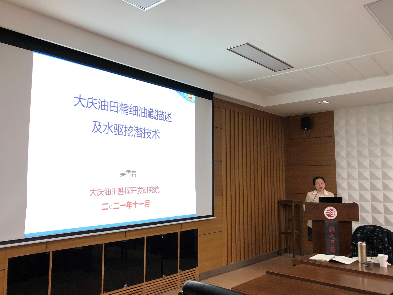 2021年11月5日下午,地球科学学院油气勘探与开发地质系邀请大庆油田有限责任公司勘探开发研究院企业技术专家姜雪岩高级工程师,在地质楼204开展了主题为“大庆油田精细油藏描述及水驱挖潜技术”的学术报告,由系副主任李庆副教授主持,我校约五十位师生及十余位企业专家到场参加了本次学术沙龙。