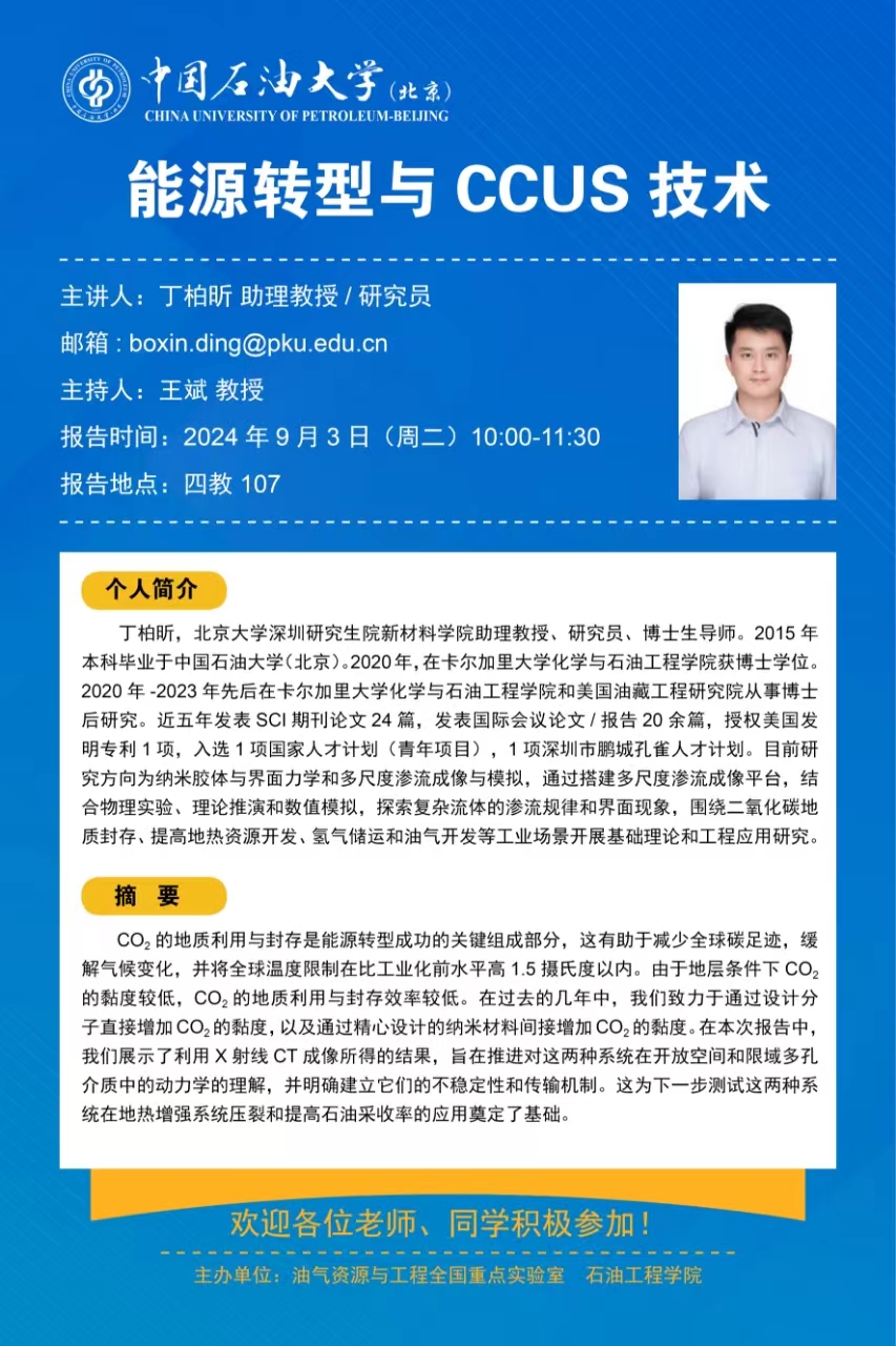 More > MORE+ 新闻动态 首位华人!实验室教师获SPE油气可持续发展与... Oct 29, 2025 Oct 29, 2025 首位华人!实验室教师获SPE油气可持续发展与领导力国际技术奖 Oct 27, 2025 “中国石油科学2025年度十佳论文”评选结果正式发布 Oct 21, 2025 李平平教授在《Science Advances》发表论文 Oct 11, 2025 新疆工程学院安全科学与工程学院院长顾继俊一行赴实验室考察交流 MORE+ 通知公告 Oct 14 中国p站中文网站(北京)油气资源与工程全国重点实验室诚聘博士后 Sep 05 油气资源与工程全国重点实验室论文最新标注说明 Oct 28 油气资源与工程学院自筹经费聘用人员管理规定 Aug 01 技术转移机构清单 MORE+ 科普讲堂 李阳院士蟒山讲坛第二十四期开讲CCUS展望 Sep 30, 2022 高德利院士为中学生带来“大师课” Aug 22, 2022 "刚性"捕集碳排放—CCUS机遇与挑战——2022年科技活动周第三讲 Jun 02, 2022 国内外地热能开发与利用概况——2022年科技活动周第二讲 Jun 01, 2022 MORE+ 学术报告 May 21 【学术报告】全球甲烷减排现状与挑战 Dec 11 【学术报告】二氧化碳地质封存的安全性监测及微泡注入技... Nov 26 【学术讲座】随钻电磁波远探测基础问题与仪器进展 Oct 24 【学术讲座】高压水射流钻井破岩技术 Aug 31 【学术讲座】能源转型与CCUS技术 MORE+ 快速通道 实验室文化 仪器预约