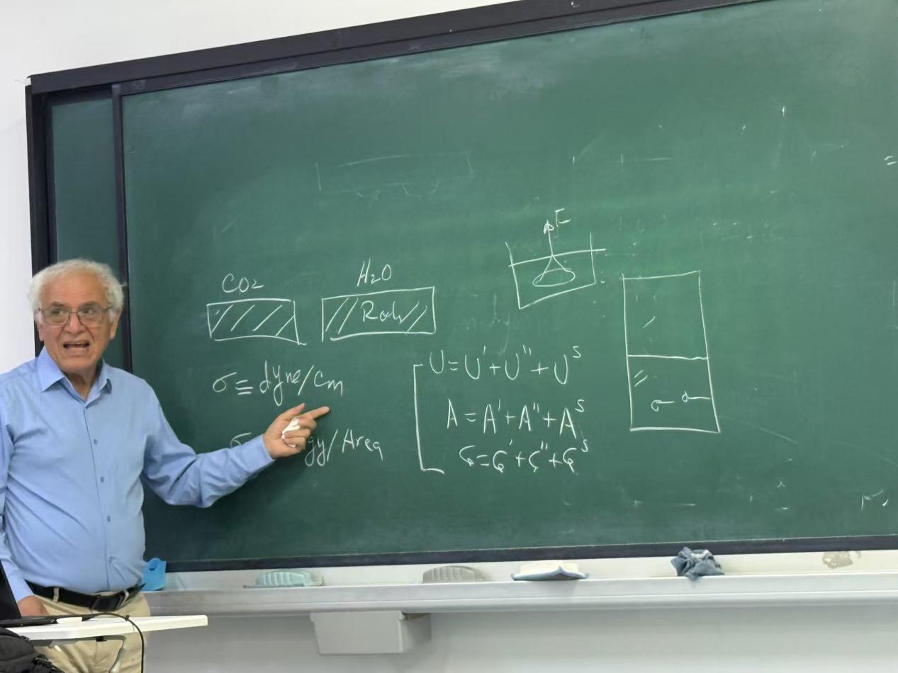 报告厅内,Firoozabadi教授系统阐释了体相与界面热力学及其在地下流体流动与热能开采中的应用理论体系。首日课程聚焦热力学基础与相态演化,Firoozabadi教授通过严谨的公式推导,结合《油气藏热力学》教材和相关学术论文,解析重力场与毛细管力场耦合作用下的三相平衡机制。次日课程深入工程实践核心,Firoozabadi教授以状态方程为例,强调闪蒸计算在碳封存设计中的关键作用,并同步关联教材内容强化理解。第三日课程转向学科前沿,Firoozabadi教授通过相场法动态模型展示裂缝扩展机理,揭示界面张力与线张力对压裂液行为的控制规律。而Hossein Hejazi教授的压轴报告呈现了重油开采技术突破,通过高温高压微观实验影像,直观展示高温乳化剂诱导的原位油包水乳液在岩石孔隙中的流动特性,结合界面流变学数据定量解析剪切应力对液滴断裂的调控机制,为重油开采提供了全新解决方案。课程间隙的每一次提问都化作学术交锋的闪电,各位同学和老师各抒己见,相继提出自己的疑问,而教授们也在耐心回答,不仅解开了同学们的疑惑,更启发了新的研究思路。