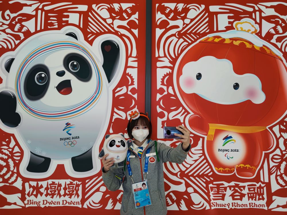 一名志愿者在延庆冬奥村内拍照留念(1月31日摄)。新华社发(郑伟博摄)