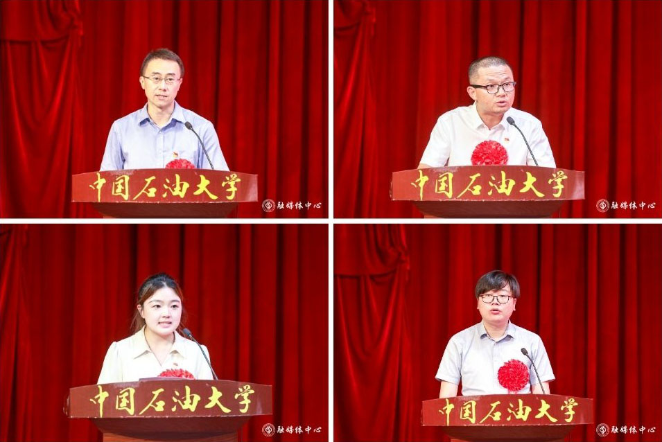 先进基层党组织代表、机械与储运工程学院党委书记王玮,优秀共产党员代表、安全与海洋工程学院教师李云涛,优秀共产党员代表、马克思主义学院学生刘语灿,优秀党务工作者代表、化学工程与环境学院重油高效清洁转化创新研究群体党支部副书记张霖宙分别发言,表达了对中国共产党成立104周年的祝福,就如何推进党建和业务深度融合、发挥基层党组织战斗堡垒和党员先锋模范作用分享了收获与感悟,表达了坚守育人初心、勇担能源报国使命的信心和决心。