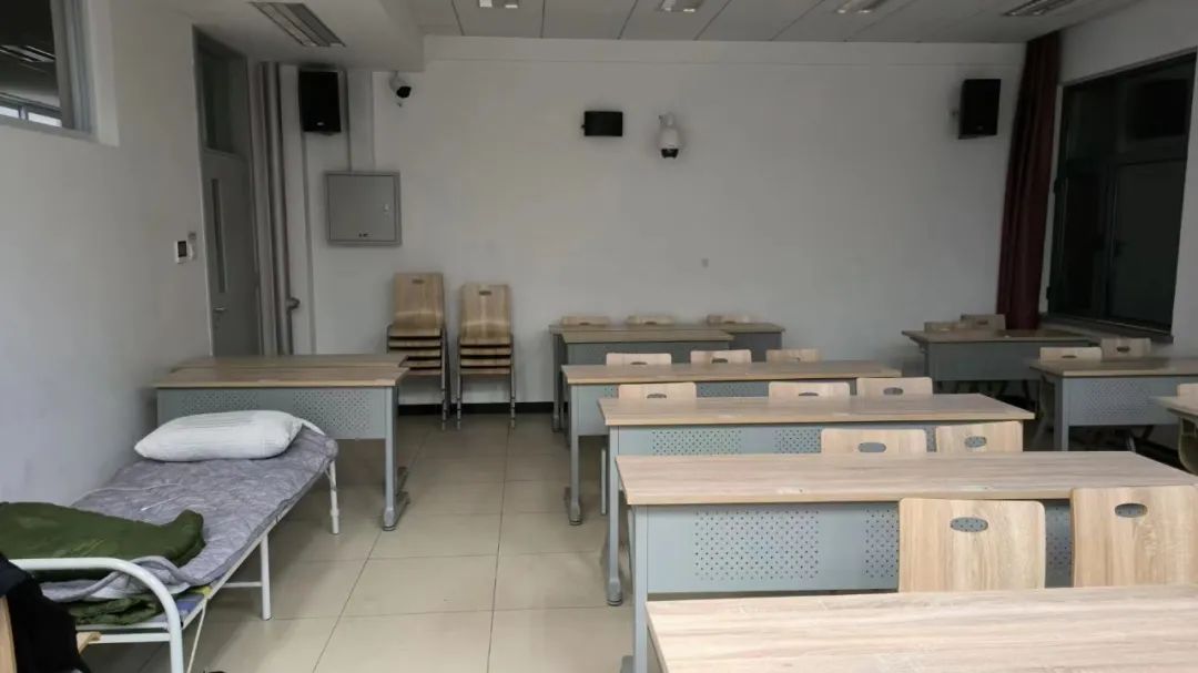 教室一角,一张窄窄的折叠床,两张椅子中间拉一条线就是挂衣架,颇有点石油大会战的味道。