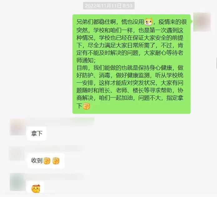 作为2021级的学业导师,赵振聪在志愿服务的间隙,还利用短暂的休息时间,坚持给班里的同学们开班会,安抚学生情绪,解答他们学业和生活上的困惑。